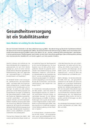 Die vier führenden Verbände in der Gesundheitsversorgung ABDA – Bundesvereinigung Deutscher Apothekenverbände, die Deutsche Krankenhausgesellschaft (DKG), die Kassenärztliche Bundesvereinigung (KBV) sowie die Kassenzahnärztliche Bundesvereinigung (KZBV) haben eine Allianz für ein „starkes, resilientes Gesundheitssystem“ geschlossen. In einem gemeinsamen Positionspapier beschreiben sie die Vision eines leistungsfähigen Gesundheitssystems als Basis einer demokratischen Gesellschaft und damit zugleich auch des sozialen Friedens.
