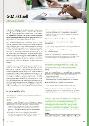 In der Serie „GOZ aktuell“ veröffentlicht das Referat Honorierungssysteme der Bayerischen Landeszahnärztekammer Berechnungsempfehlungen und Hinweise zur GOZ 2012. Zur Weitergabe innerhalb der Praxis und zum Abheften können die Beiträge aus dem Heft herausgetrennt werden. Sie sind auch auf www.bzb-online.de abrufbar.