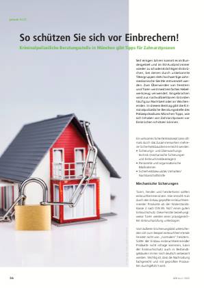 Seit einigen Jahren kommt es im Bundesgebiet und im EU-Ausland immer wieder zu schadensträchtigen Einbrüchen, bei denen durch unbekannte Tätergruppen stets hochwertige zahnmedizinische Geräte entwendet werden. Zum Überwinden von Fenstern und Türen wird meist einfaches Hebelwerkzeug verwendet. Eingebrochen wird aus nachvollziehbaren Gründen häufig zur Nachtzeit oder an Wochenenden. In diesem Beitrag gibt die Kriminalpolizeiliche Beratungsstelle des Polizeipräsidiums München Tipps, wie sich Inhaber von Zahnarztpraxen vor Einbrüchen schützen können.