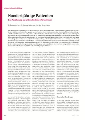 Die demografische Entwicklung in Deutschland hat eine „neue Generation“ hervorgebracht – die Hundertjährigen. Derzeit wächst wohl keine Altersgruppe so stark wie die dieser Hochbetagten. Das wissenschaftliche Interesse ist geweckt und mittlerweile sind Analysen aus unterschiedlichen Industrienationen verfügbar. Während jedoch bezüglich psychologischer und allgemeinmedizinischer Parameter schon einige Muster erkennbar sind und vorsichtige Schlussfolgerungen getroffen werden können, steht die Datenlage hinsichtlich zahnmedizinischer Fragestellungen noch ganz am Anfang. Aktuelle Studien aus Deutschland (Heidelberg, HD-Z100) charakterisierten nun erstmalig eine Kohorte Hundertjähriger hinsichtlich parodontaler, kariologischer oder prothetischer klinischer Parameter. Darüber hinaus wurde die mundbezogene Lebensqualität analysiert. Es wurde ein umfangreicher zahnmedizinischer Behandlungsbedarf und eine vielfach eingeschränkte mundbezogene Lebensqualität in dieser Kohorte festgestellt. Illustriert wird die aktuelle Datenlage durch die Kasuistik einer 99-jährigen Patientin.