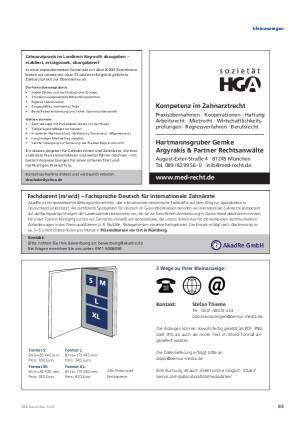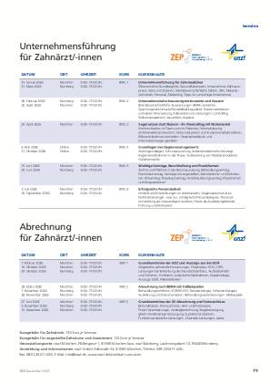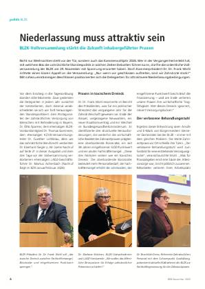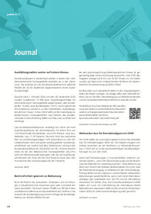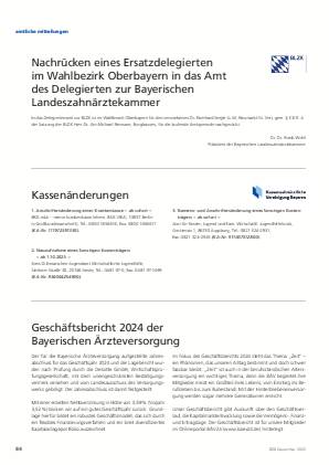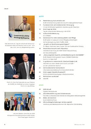 Niederlassung muss attraktiv sein – BLZK-Vollversammlung stärkt die Zukunft inhabergeführter Praxen, Zahnmedizin muss in der GKV bleiben – Vertreterversammlung der KZVB warnt vor Leistungskürzungen, Sofortversorgungskonzepte im digitalen Workflow – Fachbeitrag