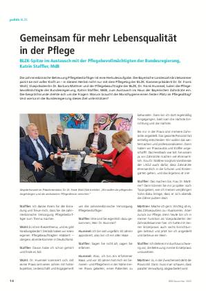 Die zahnmedizinische Betreuung Pflegebedürftiger ist eine Herkulesaufgabe. Die Bayerische Landeszahnärztekammer packt sie mit voller Kraft an – in diesem Herbst nicht nur mit dem Pflegetag der BLZK. Kammerpräsident Dr. Dr. Frank Wohl, Vizepräsidentin Dr. Barbara Mattner und der Pflegebeauftragte der BLZK, Dr. Frank Hummel, luden die Pflegebevollmächtigte der Bundesregierung, Katrin Staffler, MdB, zum Austausch ins Haus der Bayerischen Zahnärzte ein. Die Gesprächsrunde drehte sich um die Fragen: Warum braucht die Mundhygiene einen festen Platz im Pflegealltag? Und wie kann die Bundesregierung dieses Ziel unterstützen?