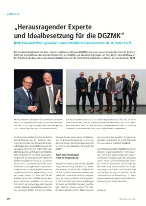 Die Deutsche Gesellschaft für Zahn-, Mund- und Kieferheilkunde (DGZMK) hat einen neuen Präsidenten: Prof. Dr. Dr. Peter Proff trat Ende Oktober das Amt des Präsidenten der DGZMK und damit die Nachfolge von Prof. Dr. Dr. Jörg Wiltfang an. Der Präsident der Bayerischen Landeszahnärztekammer, Dr. Dr. Frank Wohl, gratulierte im Namen des Vorstands der BLZK.