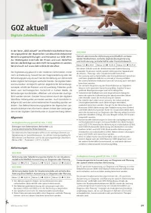 In der Serie „GOZ aktuell“ veröffentlicht das Referat Honorierungssysteme der Bayerischen Landeszahnärztekammer Berechnungsempfehlungen und Hinweise zur GOZ 2012. Zur Weitergabe innerhalb der Praxis und zum Abheften können die Beiträge aus dem Heft herausgetrennt werden. Sie sind auch auf www.bzb-online.de abrufbar.