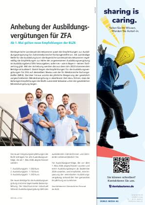Die Bayerische Landeszahnärztekammer passt die Empfehlungen zur Ausbildungsvergütung für Zahnmedizinische Fachangestellte an. Als zuständige Stelle für die Ausbildung kann die Bayerische Landeszahnärztekammer regelmäßig die Empfehlungen zur Höhe der angemessenen Ausbildungsvergütung im Ausbildungsberuf ZFA herausgeben, sofern es – wie in Bayern – keinen Tarifvertrag gibt. Mit der Anhebung werden die aus dem Jahr 2023 stammenden Beträge aktualisiert. Damit liegen die Empfehlungen für die Ausbildungsvergütungen für ZFA auf demselben Niveau wie die für Medizinische Fachangestellte (MFA). Darüber hinaus würde die jährliche Steigerung der gesetzlich vorgeschriebenen Mindestvergütung in absehbarer Zeit dazu führen, dass die bisherigen Empfehlungen der BLZK zumindest teilweise unter der gesetzlichen Mindestvergütung liegen.