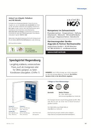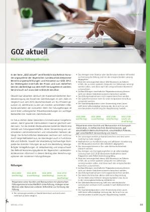 In der Serie „GOZ aktuell“ veröffentlicht das Referat Honorierungssysteme der Bayerischen Landeszahnärztekammer Berechnungsempfehlungen und Hinweise zur GOZ 2012. Zur Weitergabe innerhalb der Praxis und zum Abheften können die Beiträge aus dem Heft herausgetrennt werden. Sie sind auch auf www.bzb-online.de abrufbar.