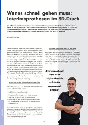 Der 3D-Druck von Interimsprothesen gewinnt im Dentallabor zunehmend an Bedeutung. Entscheidend dabei ist die Materialwahl. Der Autor arbeitet seit einiger Zeit mit dem biokompatiblen 3D-Druckharz optiprint interim (dentona AG). Besonderheit des Werkstoffs: Die hohe Bruch- und Biegefestigkeit bei gleichzeitig guter Verarbeitbarkeit ermöglicht einen effizienten und sicheren Workflow.