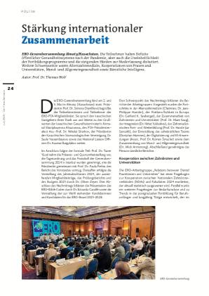 ERO-Generalversammlung Almaty/Kasachstan. Die Teilnehmer haben Defizite öffentlicher Gesundheitssysteme nach der Pandemie, aber auch die Uneinheitlichkeit der Fortbildungsprogramme und die steigenden Hürden zur Niederlassung diskutiert. Weitere Schwerpunkte waren Alterszahnmedizin, Kooperationen von Praxen und Universitäten, Mund- und Allgemeingesundheit sowie Künstliche Intelligenz.