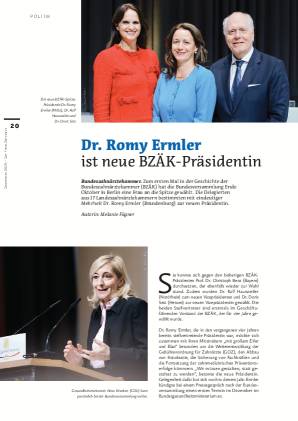 Zum ersten Mal in der Geschichte der Bundeszahnärztekammer (BZÄK) hat die Bundesversammlung Ende Oktober in Berlin eine Frau an die Spitze gewählt. Die Delegierten aus 17 Landeszahnärztekammern bestimmten mit eindeutiger Mehrheit Dr. Romy Ermler (Brandenburg) zur neuen Präsidentin.