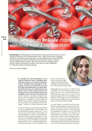 Die Wartung von Feuerlöschern alle zwei Jahre ist eine von vielen lästigen Pflichten in der Zahnarztpraxis. Seit 1. März hat der Freie Verband Deutscher Zahnärzte eine Kooperation mit der Brandschutz-Firma PRYMOS, die als einzige zehn Jahre wartungsfreie Feuerlöscher anbietet. Worauf müssen Praxisinhaber achten? Wie viele Feuerlöscher sind gefordert, und wo müssen sie platziert werden? Das haben wir die Zahnärztin Dr. Wassiliki Ioanna Daskalaki gefragt.