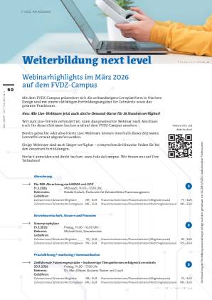 Mit dem FVDZ-Campus präsentiert sich die verbandseigene Lernplattform in frischem Design und mit einem vielfältigen Fortbildungsangebot für Zahnärzte sowie das gesamte Praxisteam. Neu: Alle Live-Webinare jetzt auch als On-Demand-Kurse für 24 Stunden verfügbar! Wer zum Live-Termin verhindert ist, kann das gewünschte Webinar nach Abschluss noch für diesen Zeitraum buchen und auf dem FVDZ-Campus ansehen. Bereits gebuchte oder absolvierte Live-Webinare können innerhalb dieses Zeitraums kostenfrei erneut abgerufen werden.Einige Webinare sind auch länger verfügbar – entsprechende Hinweise finden Sie bei den einzelnen Fortbildungen.Einfach anmelden und direkt buchen: www.fvdz.de/campus. Wir freuen uns auf Ihre Teilnahme!