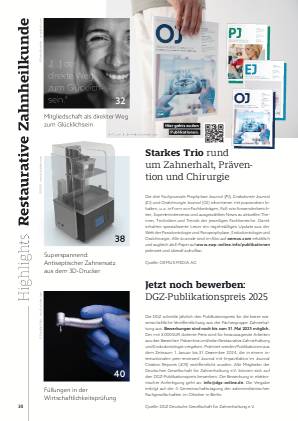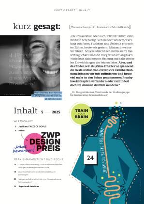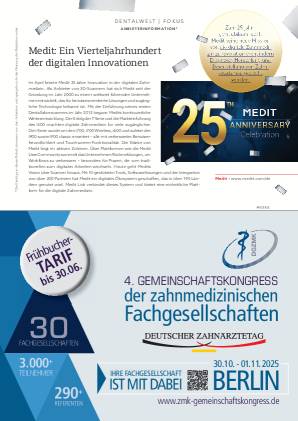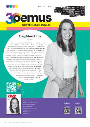 Die OEMUS MEDIA AG feiert mehr als drei Jahrzehnte Dentalmarkt-Power – aus diesem Anlass finden Sie in jeder ZWP -Ausgabe 2025 ZWP -Ausgabe 2025 ZWP Hintergrundinfos zu unserem Team und den Verlag-Units