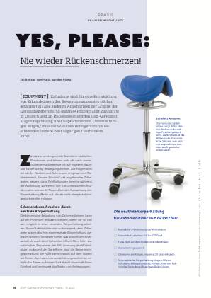 [ Equipment ] Zahnärzte sind für eine Entwicklung von Erkrankungen des Bewegungsapparates stärker gefährdet als alle anderen Angehörigen der Gruppe der Gesundheitsberufe. So leiden 64 Prozent aller Zahnärzte in Deutschland an Rückenbeschwerden und 42 Prozent klagen regelmäßig über Kopfschmerzen. Untersuchungen zeigen,[1] dass die Wahl des richtigen Stuhls Beschwerden lindern oder sogar ganz verhindernkann.