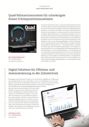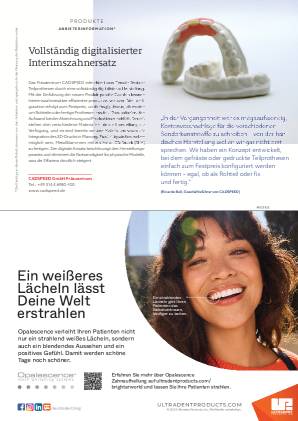 Während ästhetische Universal-Composites aufwendig in 2 Millimeter Inkrementen geschichtet und polymerisiert werden müssen, bieten Bulk-Fill-Com-posites den Vorteil, Inkremente bis 4 Millimeter in die Kavität zu applizieren. Jedoch werden Bulk-Fill-Composites aufgrund einer häufig unzureichenden Ästhetik fast nur für den Seitenzahnbereich genutzt. Diese Einschränkung löst VOCO mit dem neuen Universal-Composite GrandioSO Unlimited auf: Das ästhetische Material kann in 4 Millimeter-Inkremen- ten in die Kavität appliziert werden und ist sowohl für den Front- als auch Seitenzahnbereich indiziert...