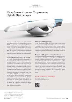 Die Henry Schein Dental Deutschland GmbH hat ihr vielseitiges Sortiment an Intraoralscannern um den TRIOS 6 erweitert: Das neueste kabellose Modell von 3Shape kommt sowohl für Einsteiger als auch für erfahrene Anwender der digitalen Abformung infrage. Der TRIOS 6 vereint Vorzüge vorheriger Modelle, wie etwa den intuitiven Scanablauf, mit wegweisenden Neuerungen. Diese erweitern die Anwendungsmöglichkeiten und helfen Zahnärzten, die Patientenbetreu- ung zu verbessern