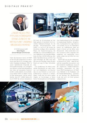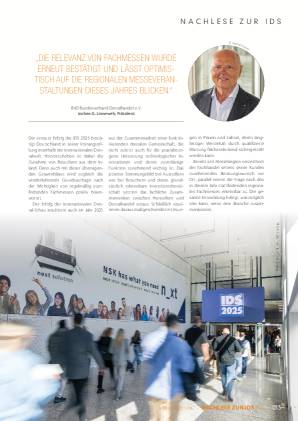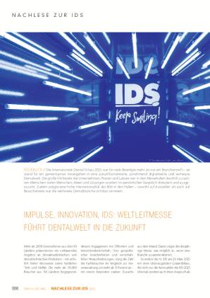 Der erneute Erfolg der IDS 2025 bestä- tigt Deutschland in seiner Vorrangstellung innerhalb der internationalen Den- talwelt. Hervorzuheben ist dabei die Zunahme von Besuchern aus dem Inland. Denn auch mit dieser überragenden Gesamtbilanz wird zugleich die wiederkehrende Grundsatzfrage nach der Wichtigkeit von regelmäßig stattfindenden Fachmessen positiv beantwortet...