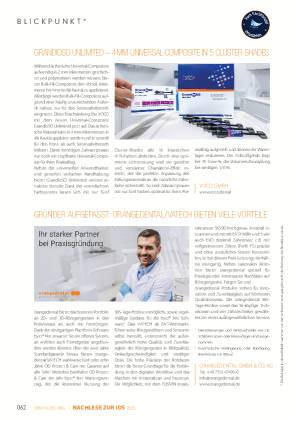 Diese IDS war für uns eine ganz besondere Messe: Wir haben nämlich erstmalig ganze acht Neuheiten präsentiert! Unser Team aus der Forschung und Entwicklung verwöhnt unsere Kunden ja jährlich mit tollen Neuprodukten, aber dieses Jahr haben sie sich wirk- lich selber übertroffen. Besonderes Highlight ist unser neues Mitglied der GrandioSO-Familie: GrandioSO Unlimited ist ein 4 mm-Universal-Composite, das sowohl für den Seitenzahn- als auch für den Frontzahnbereich indiziert ist! Ein weiterer Clou ist das verein- fachte Farbsystem mit fünf Cluster-Shades, die alle 16 klassischen VITA-Farben abdecken...