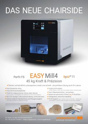Erfahrungsbericht // Im Rahmen der Einweihungsfeier der orangedental Fortbildungsakademie „Ocademy“ im April 2024 wurde die neue Schleifeinheit EASYMill 4 (orangedental) einer breiten Öffentlichkeit vorgestellt. Die ersten Erfahrungen mit dieser innovativen CNC-Schleifmaschine, der dazugehörigen CAM-Software und einem neuen Zirkonoxidmaterial werden im Beitrag nach achtmonatiger Erprobungszeit beschrieben und zwei Anwendungsfälle dazu dargestellt.