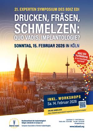 Wenn sich Fachkompetenz, Innovationsgeist und rheinische Lebensfreude begegnen, dann ist es wieder Zeit für das Experten Symposium des BDIZ EDI in Köln. Das Thema: Drucken, fräsen, schmelzen: Quo vadis, Implantologie? Am 15. Februar 2026 dreht sich das eintägige Symposium um digitale Fertigungstechnologien, die die implantologische Praxis revolutionieren. Einen Tag zuvor, am 14. Februar 2026, bietet der BDIZ EDI Workshops seiner Industriepartner an.