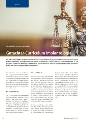 Der BDIZ EDI kündigt für das Jahr 2026 ein Gutachter-Curriculum Implantologie an. Damit erweitert der Verband sein Fortbildungsangebot um ein Programm, das speziell an interessierte Zahnärztinnen und Zahnärzte adressiert ist, die hinter die Kulissen der Arbeit von zahnärztlichen Sachverständigen, von Gerichten und Anwälten bei Streitfällen blicken und sich als Gutachter qualifizieren wollen.