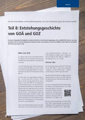 In dieser Folge gibt die Redaktion weitere Einblicke in die Feststellungsklage, die vom BDIZ EDI initiiert und vom Justiziar Prof. Dr. Thomas Ratajczak erarbeitet wurde. In Teil 8 geht es weiter mit BEMA-Z über GOÄ bis schließlich die GOZ beschrieben wird.