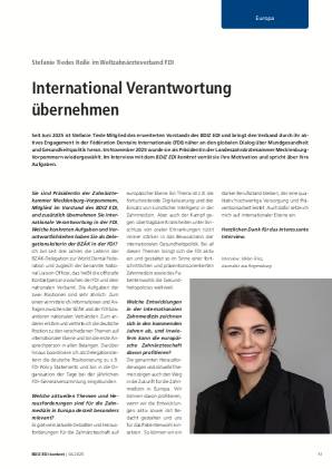 Seit Juni 2025 ist Stefanie Tiede Mitglied des erweiterten Vorstands des BDIZ EDI und bringt den Verband durch ihr aktives Engagement in der Fédération Dentaire Internationale (FDI) näher an den globalen Dialog über Mundgesundheit und Gesundheitspolitik heran. Im November 2025 wurde sie als Präsidentin der Landeszahnärztekammer Mecklenburg-Vorpommern wiedergewählt. Im Interview mit dem BDIZ EDI konkret verrät sie ihre Motivation und spricht über ihre Aufgaben.