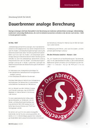 Analoge Leistungen sind fester Bestandteil in der Berechnung von modernen zahnärztlichen Leistungen. Selbstständige, medizinisch notwendige Maßnahmen, die nicht im Gebührenverzeichnis enthalten sind, können nach § 6 Abs. 1 GOZ in Ansatz gebracht werden.