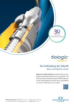 Zum 30-jährigen Jubiläum der TIOLOX®/tioLogic®-Implantologie bei Dentaurum steht tioLogic® TWINFIT in einer modernen, hochwertigen Optik im Mittelpunkt, das bewährte klinische Zuverlässigkeit mit innovativer Verbindungstechnologie vereint. Die einzigartige Anschlussgeometrie mit der Wahlmöglichkeit zwischen Konus und Plattform ermöglicht maximale Flexibilität in der prothetischen Versorgung – bei gleichzeitig stabiler Verbindung. Damit setzt Dentaurum neue Maßstäbe für präzise, langlebige und effiziente implantologische Lösungen – im Praxis- und Laboralltag gleichermaßen.