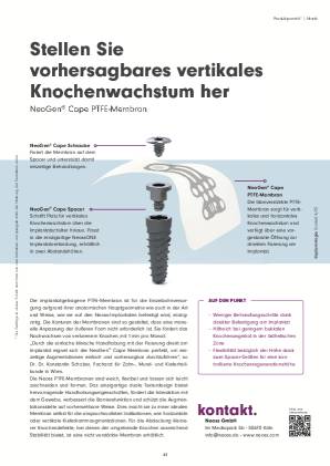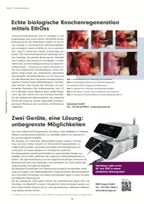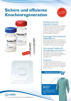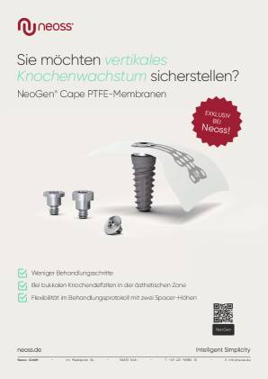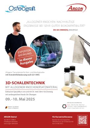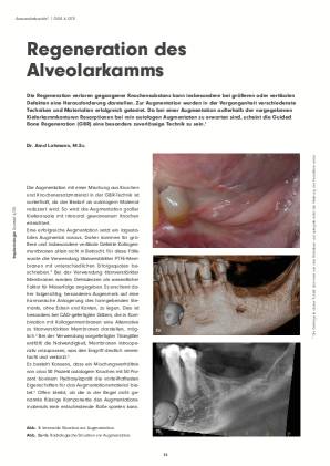 Die Regeneration verloren gegangener Knochensubstanz kann insbesondere bei größeren oder vertikalen Defekten eine Herausforderung darstellen. Zur Augmentation wurden in der Vergangenheit verschiedenste Techniken und Materialien erfolgreich getestet. Da bei einer Augmentation außerhalb der vorgegebenen Kieferkammkonturen Resorptionen bei rein autologen Augmentaten zu erwarten sind, scheint die Guided Bone Regeneration (GBR) eine besonders zuverlässige Technik zu sein.1
