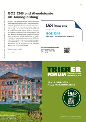 Die GOZ 3240 Vestibulumplastik oder Mundbodenplastik kleineren Umfangs, auch Gingivaextensionsplastik, je Kieferhälfte oder Frontzahnbereich, für einen Bereich bis zu zwei nebeneinander liegenden Zähnen, ggf. auch am zahnlosen Kieferabschnitt wird im Bundesdurchschnitt (Januar 2024 bis Dezember 2024) mit dem 3,0-fachen Faktor abgerechnet. Um das GKV-Niveau zu erreichen, muss mit dem 4,93-fachen Faktor abgerechnet werden. Alveolotomie im Zusammenhang mit Extraktionen ist weder in der GOZ noch in der GOÄ enthalten und muss daher als Analogleistung im Sinne des § 6 Abs. 1 GOZ berechnet werden. Die Leistung wird im Bundesdurchschnitt mit einem Betrag i. H. v. 115,51 Euro honoriert...