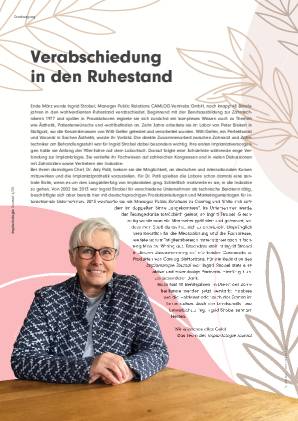 Ende März wurde Ingrid Strobel, Manager Public Relations CAMLOG Vertriebs GmbH, nach knapp 48 Berufsjahren in den wohlverdienten Ruhestand verabschiedet. Beginnend mit der Berufsausbildung zur Zahntechjahren in den wohlverdienten Ruhestand verabschiedet...