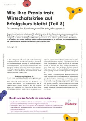 Angesichts der weiterhin anhaltenden Wirtschaftskrise ist es für den Zahnarztunternehmer von existenzieller Bedeutung, vorhandene, sozusagen schlummernde Gewinnpotenziale zu heben. Dabei bietet es sich an, zweigleisig zu fahren, nämlich (I.) das Abrechnungswesen an einen externen, professionellen Dienstleister zu übertragen und (II.) die Forderung gegen Patienten an einen Factor zu verkaufen, um das eigene finanzielle Risiko möglichst auf Null zu senken und sofort liquide zu sein.