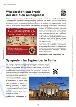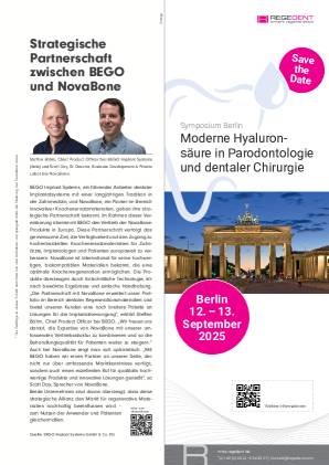 Das Symposium „Moderne Hyaluronsäure in Parodontologie und dentaler Chirurgie“ findet am 12. und 13. September 2025 in Berlin statt. Die praxisnahe Veranstaltung richtet sich an das gesamte Team aus Zahnmedizin, Parodontologie, Oral- und MKG- Chirurgie, das sich für die neuesten Entwicklungen und wissenschaftlichen Erkennt- nisse auf diesem Gebiet interessiert...