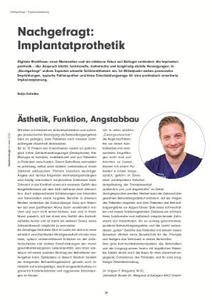 Digitale Workflows, neue Materialien und ein stärkerer Fokus auf Biologie verändern die Implantatprothetik – der Anspruch bleibt: funktionelle, ästhetische und langfristig stabile Versorgungen. In „Nachgefragt“ ordnen Experten aktuelle Schlüsselthemen ein. Im Mittelpunkt stehen praxisnahe Empfehlungen, typische Fehlerquellen und klare Entscheidungswege für eine prothetisch orientierte Implantatplanung.