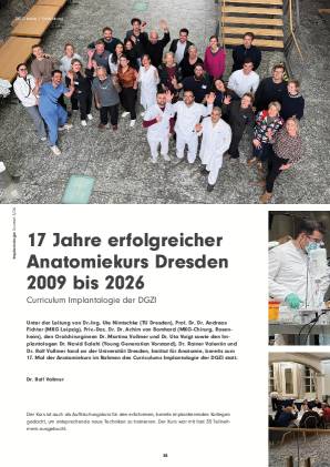 Unter der Leitung von Dr.-Ing. Ute Nimtschke (TU Dresden), Prof. Dr. Dr. Andreas Fichter (MKG Leipzig), Priv.-Doz. Dr. Dr. Achim von Bomhard (MKG-Chirurg, Rosenheim), den Oralchirurginnen Dr. Martina Vollmer und Dr. Uta Voigt sowie den Implantologen Dr. Navid Salehi (Young Generation Vorstand), Dr. Rainer Valentin und Dr. Rolf Vollmer fand an der Universität Dresden, Institut für Anatomie, bereits zum 17. Mal der Anatomiekurs im Rahmen des Curriculums Implantologie der DGZI statt.