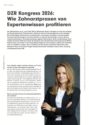 Der DZR Kongress am 8. und 9. Mai 2026 im Mövenpick Hotel in Stuttgart ist eines der wichtigsten Branchenevents für Zahnärztinnen, Zahnärzte sowie Praxismanagerinnen und -manager. Mit hochkarätigen Referentinnen und Referenten, praxisnahen Vorträgen und spannendem Austausch gibt der Kongress wertvolle Einblicke in aktuelle Entwicklungen rund um Abrechnung, Kommunikation, Personalentwicklung, digitale Zahnmedizin, Recht und Marketing. Doch welchen konkreten Mehrwert bietet der Kongress den teilnehmenden Zahnarztpraxen? Welche Inhalte lassen sich direkt in den Praxisalltag integrieren? Und inwiefern eröffnet die Teilnahme nicht nur inhaltlich, sondern auch im Hinblick auf den Ausbau beruflicher Netzwerke einen Mehrwert? Diese und weitere Fragen beantwortet Désirée Lobstädt, Leiterin Tools, Coaching und Akademie beim DZR.