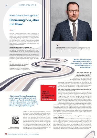Geraten Kieferorthopäden in finanzielle Schwierigkeiten, gelten für sie Besonderheiten, die eine Sanierung grundsätzlich einfacher als bei anderen freien Berufen ermöglichen. Was diese Besonderheiten sind und was sonst noch zu beachten ist, erläutert Alexander Eggen von Schultze & Braun...