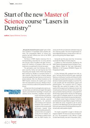 Already the eleventh master course ”Lasers in Dentistry” started on 14 September 2009 in Aachen, Germany. This postgraduate Master of Science programme has been offered since 2004 at the RWTH Aachen University...