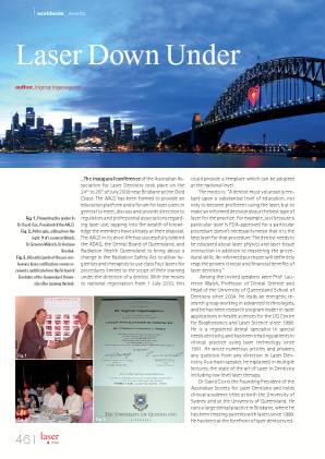 he inaugural conference of the Australian Association for Laser Dentistry took place on the 24th to 26th of July 2009 near Brisbane at the Gold Coast. The AALD has been formed to provide an education platform and a forum for laser users in general to meet, discuss and provide direction to regulators and professional associations regarding laser use, tapping into the wealth of knowledge the members have already at their disposal. The AALD in its short life has successfully lobbied the ADAQ, the Dental Board of Queensland, and Radiation Health Queensland to bring about a change in the Radiation Safety Act to allow hygienists and therapists to use class four lasers for procedures limited to the scope of their training under the direction of a dentist. With the moves to national registration from 1 July 2010, this could provide a template which can be adopted at the national level...