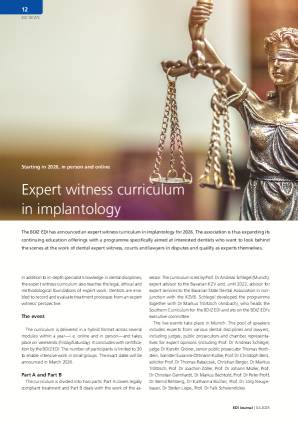 The BDIZ EDI has announced an expert witness curriculum in implantology for 2026. The association is thus expanding its continuing education offerings with a programme specifically aimed at interested dentists who want to look behind the scenes at the work of dental expert witness, courts and lawyers in disputes and qualify as experts themselves.