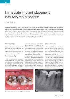 Immediate placement of implants into fresh extraction sockets has been shown to deliver good outcomes. The literature reports good implant survival rates, as well as acceptable marginal bone loss, gingival recession and aesthetics.1 In particular, there is evidence that immediate implant placement into molar sites leads to predictable outcomes and high success rates.2 The same study suggests that grafting around the implant in these situations and using an anatomic healing abutment can further reduce resorption of the bone. The following case report demonstrates the successful implementation of immediate implant placement in fresh molar extraction sockets.