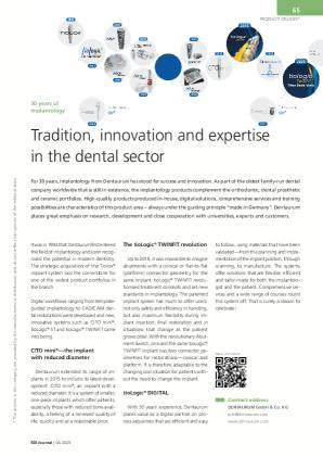 For 30 years, implantology from Dentaurum has stood for success and innovation. As part of the oldest family-run dental company worldwide that is still in existence, the implantology products complement the orthodontic, dental prosthetic and ceramic portfolios. High-quality products produced in-house, digital solutions, comprehensive services and training possibilities are characteristics of this product area – always under the guiding principle “made in Germany”. Dentaurum places great emphasis on research, development and close cooperation with universities, experts and customers.